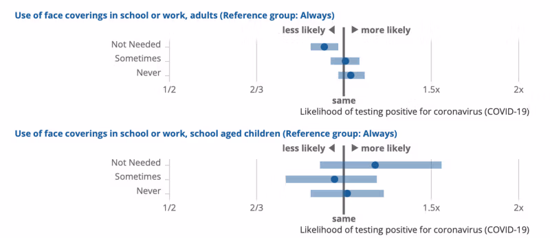 Hasonlóképpen, azok a felnőttek, akik olyan környezetben dolgoztak vagy jártak iskolába, ahol „nem volt szükség maszkviselésre”, kisebb valószínűséggel lettek pozitív teszteredményűek, mint azok, akik „mindig” viseltek maszkot ugyanebben a környezetben.