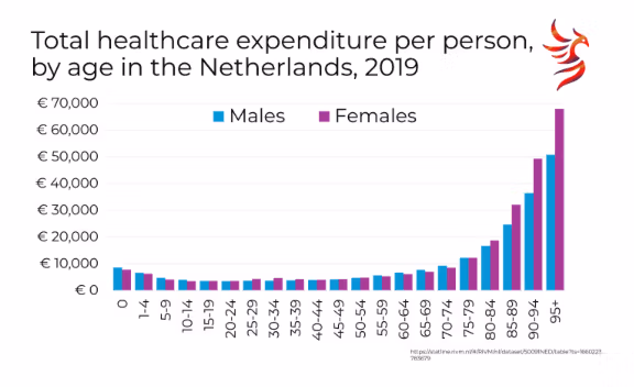 Vegyük figyelembe az alábbi grafikont, amely a teljes orvosi költségeket mutatja korcsoportok szerint Hollandiában, egy olyan országban, amely sok hasonló egészségügyi szektorbeli jellemzővel rendelkezik, mint az Egyesült Államok, és amelynek egészségügyi kiadásai különösen jól dokumentáltak. A kiadások minden kategóriában nem elhanyagolhatók, még a késő tizenévesek és a húszas éveikben járó emberek esetében sem, az állandó ellenőrzések, diagnózisok és kezelések miatt. A kiadásoknak van egy mini-csúcsa születéskor, ami az évtizedek során egyre drágább kórházi élménnyé vált, nem pedig olcsó, szülésznő által segített élménysé.