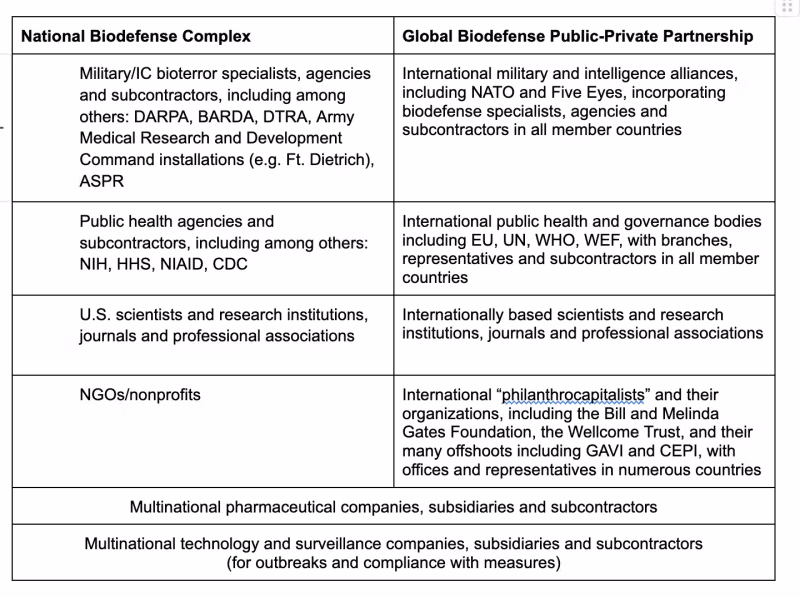 Ez a táblázat leírja azt a konglomerátumot, amelyről úgy vélem, hogy a felelős volt – a Biodefense GPPP-t –, beleértve annak számos, világméretű összetevőjét (amelyeket hosszasan tárgyalunk egy előző cikkben). A táblázat azt mutatja, hogyan skálázódik a biovédelmi komplexum a nemzeti komponensektől a nemzetközi komponensekig. Ez nemcsak az Egyesült Államokban igaz, hanem számos olyan országban is, amelyek szinte azonos módon reagáltak a Covidra.