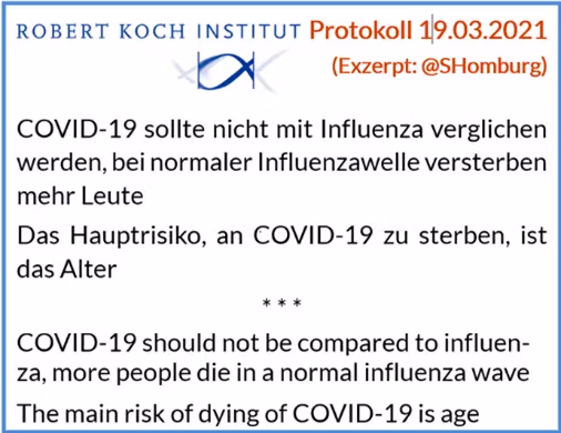Miközben az RKI előadói hangsúlyozták a közegészségügyi vészhelyzet fennállását, túlságosan is jól tudták, hogy a koronavírus az influenzához hasonlítható. Ezt 2021 márciusában, a szigorú kijárási tilalom alatt jegyezték meg, amelyet röviddel ezután kijárási tilalommal szigorítottak meg: