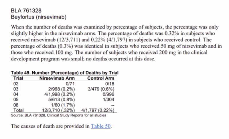 FDA-k Integrált felülvizsgálat A nirsevimab esetében kifejezetten megjelölték a gyermekgyógyászati vizsgálatokban megfigyelt halálozások „váratlan egyensúlyhiányát”. Az adatok a következők (49. táblázat, 117. o.):