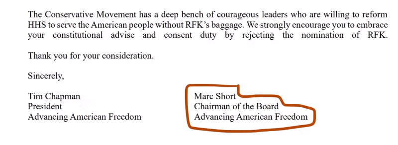 egy levél A republikánus szenátoroknak címzett levélben Tim Chapman, az AAF elnöke és Marc Short, az igazgatótanács elnöke számos „aggályukat” fogalmazzák meg Robert F. Kenndy Jr. (RFK) (sic) „HHS élére való jelölésével” kapcsolatban, például a vakcinákkal, a pszichedelikumokkal és az abortusszal kapcsolatos nézeteivel kapcsolatban.