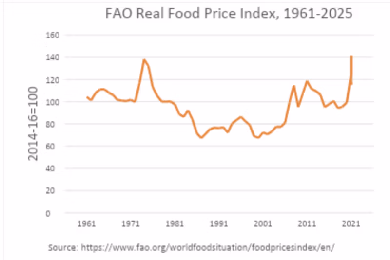 A világ mezőgazdasága rossz állapotban van, könnyedén alkalmazkodik a növekvő népességhez, a kereskedelmi útvonalakat ért jelentős sokkok ellenére is. világméretű élelmiszerárak amelyek 2022 elején tetőztek, visszaestek az 1973-as (reálértéken mért) szintre, miközben az egy főre jutó reáljövedelem több mint 250%-kal emelkedtek 1970 ótaEz elképesztően jó hír, aminek oka lényegében a rengeteg szabad mezőgazdasági terület, amelyet meg lehet és meg is fognak művelni, amikor az élelmiszerárak emelkednek. A művelés alatt nem álló földterületek kiaknázatlan potenciálja az idők során megnőtt, ahogy a hozamok emelkedtek, és az éghajlat kedvezőbbé vált a termesztéshez. Kanada, Közép-Ázsia, Brazília és más országok még mindig hatalmas szabad mezőgazdasági kapacitással rendelkeznek.